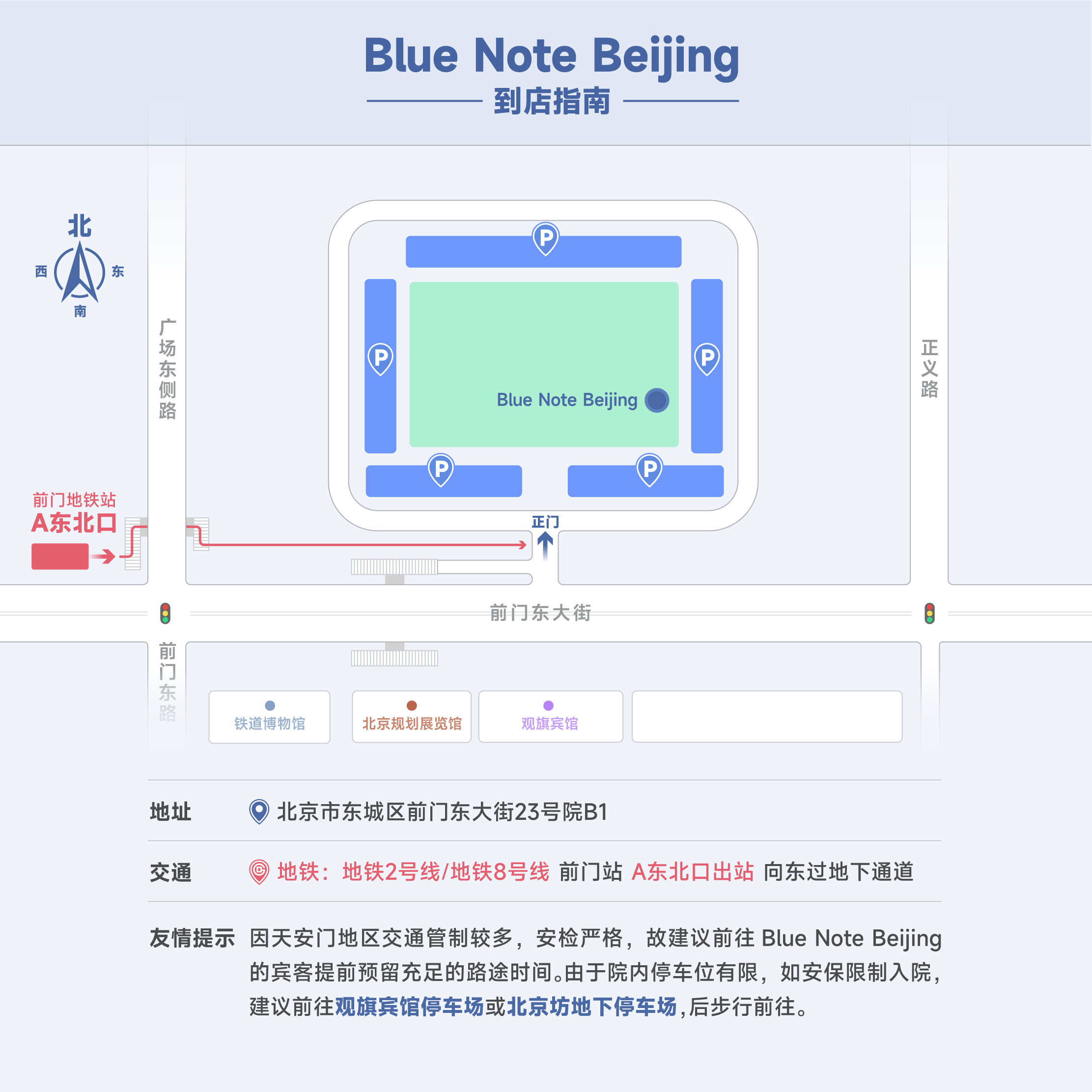 建议停车至前门23号院内(少量车位);或前门东大街观旗宾馆收费停车场,步行过地下通道即可到达院内