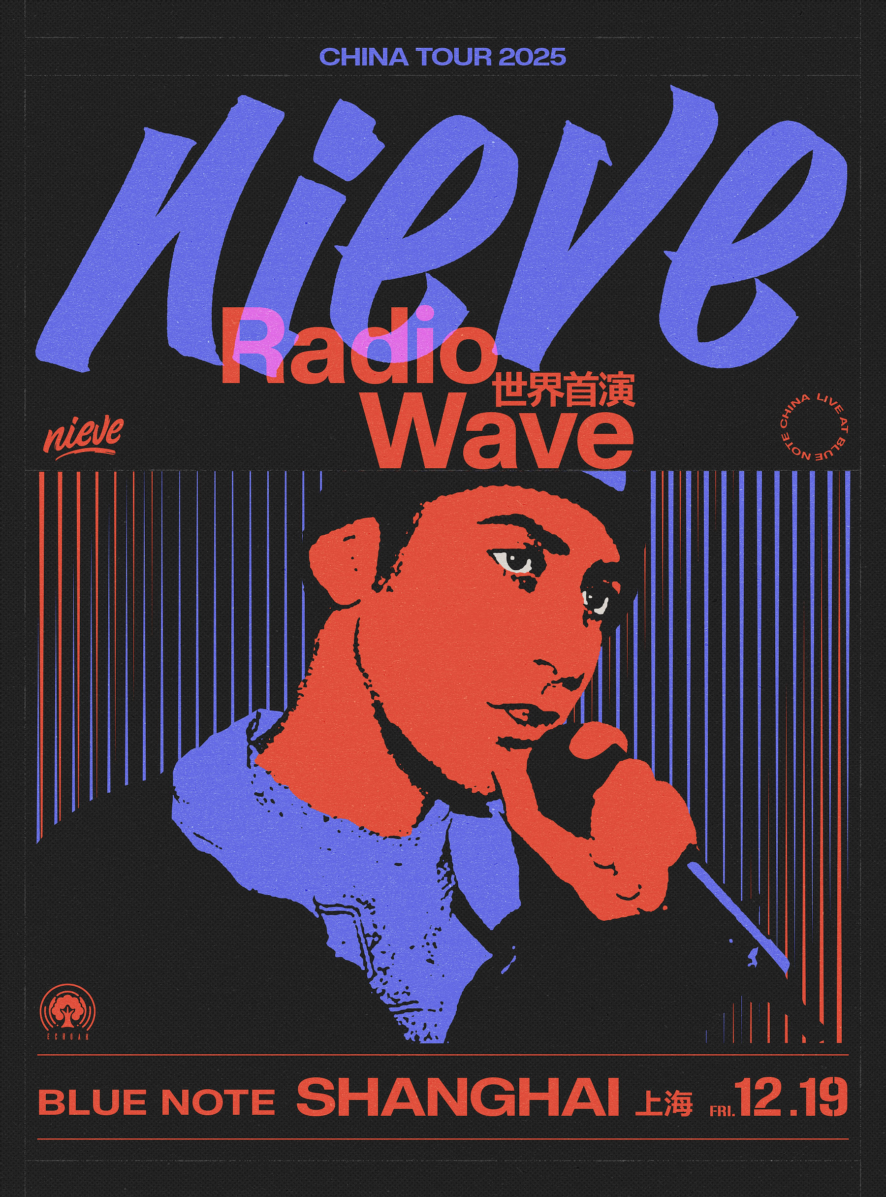 Nieve 以鲜活的文字、真挚的情感和富感染力的舞台表现著称,曾在亚洲多地巡演,并在中国、日本、韩国等地积累了极高的人气。2025 年 12 月,Nieve 将再度回到中国展开全新巡演,演出场地包括Blue Note Shanghai、Blue Note Beijing以及其他主要城市的舞台,同时也将为他即将在 2025 年 12 月发行的新专辑《Radio Wave》进行宣传。