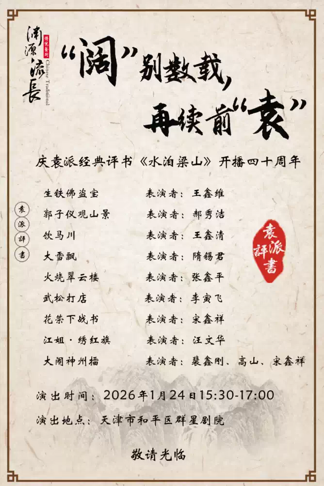 继2025年袁阔成先生逝世十周年《水泊梁山》专场演出,袁田评书艺术工作室再次将袁派经典评书《水泊梁山》搬上舞台,为天津的热情观众奉上一台精彩的评书专场演出。本场演出深度融合了 “复古视觉”、“沉浸串场” 与 “情感互动” 三大支柱,以 “台上台下共参演” 的模式,带您重温那个围炉赏艺的温情年代。