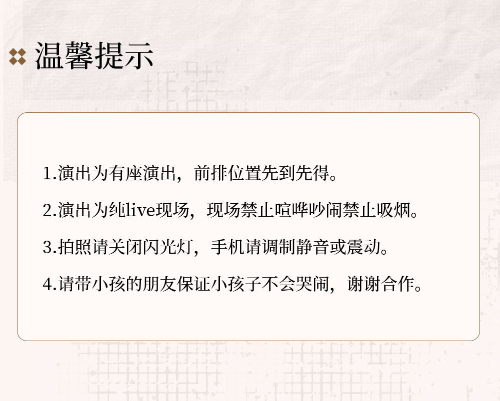演出时长约90分钟,请提前15分钟入场;