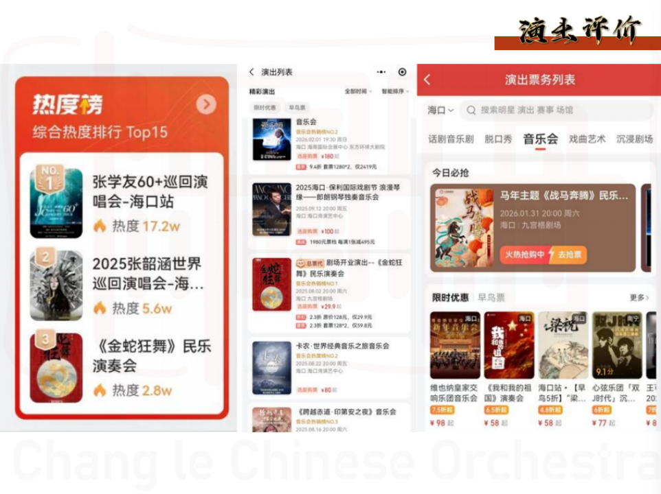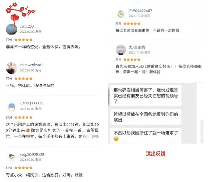福利演出:长乐国乐团成立于2024年5月,是一支演出革新民族乐器演奏团队, 通过创新改编流行与传统曲目,以民乐演绎实现"旧曲新听",展现中国 音乐魅力。近两年时间分别在东方大剧院、保亭影剧院、万达影城(日 月店)等多地演出了《大音希声》、《金蛇狂舞》、《青鸟》、《我和 我的祖国》、《永远同在》、《战马奔腾》、《梦回红楼》等主题演奏 会,演出场次达百场。受到了众多观众的喜爱,也在不断的演出中完善 自己,让演出更具备观赏性。