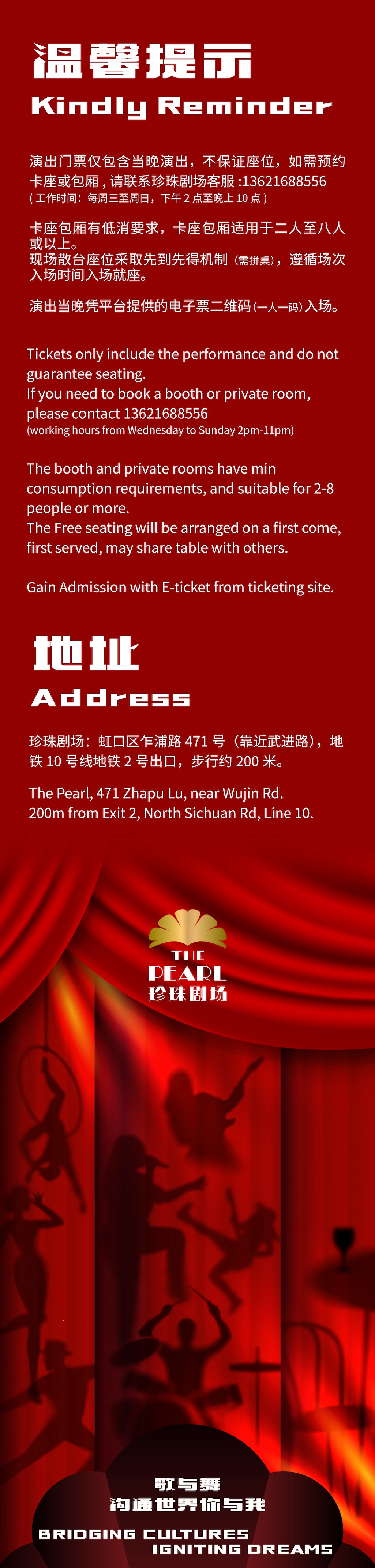 Tickets only include the performance and do not guarantee seating. If you need to book a booth or private room, please contact 13621688556 (working hours from Tuesday to Saturday 2pm-11pm).